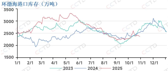 CCTD监测数据显示,截至10月27日,环渤海主要港口煤炭库存近日连续下降,总量为2367.3万吨,同比下降152.6万吨,处于近年来同期偏低水平,与过去两年同期库存持续爬升的走势明显不同。