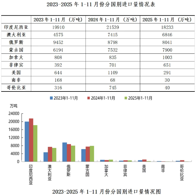 2025年1-11月,我国从菲律宾、澳大利亚、俄罗斯、印尼、南非、美国和哥伦比亚进口煤炭数量同比均出现不同程度的减少,降幅分别为7%、8%、9%、15%、56%、74%和95%。我国从蒙古国和加拿大进口煤炭数量同比增加5%和20%,但值得注意的是,我国从这两个国家进口的煤炭以炼焦煤为主,尤其是从加拿大进口的煤炭97%都是炼焦煤。