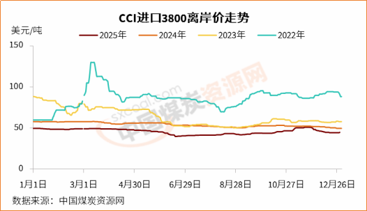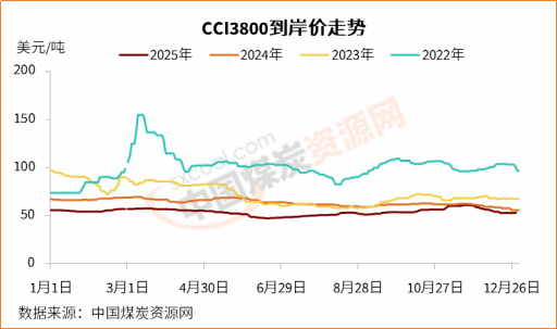 截至12月26日,CCI进口3800大卡动力煤中国南方港到岸价为53美元/吨,较前一周持平;CCI进口4700大卡动力煤到岸价为72美元/吨,较前一周下降0.5美元/吨;CCI进口5500大卡动力煤到岸价为85美元/吨,较前一周下降4.7美元/吨。