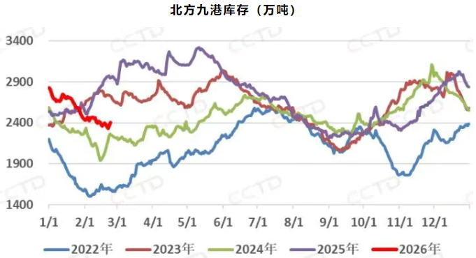 长假期间北港调入调出低位运行,随着假期临近尾声产地发运略有恢复,叠加近两日大风封航影响,北港库存长假期间先降后增。2月23日库存2403.6万吨,较14日略降11万吨,接近常年表现,同比下降545万吨。