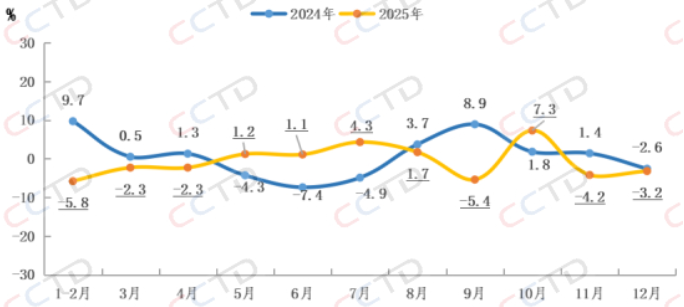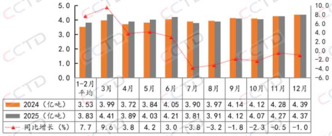 运输方面,2025年12月份,全国铁路煤炭发运量2.35亿吨,同比下降5.2%,其中发运电煤1.92亿吨,同比下降6.9%。1-12月份,全国铁路累计发运煤炭27.65亿吨,同比下降2.1%,其中累计发运电煤23.27亿吨,同比下降4.3%。