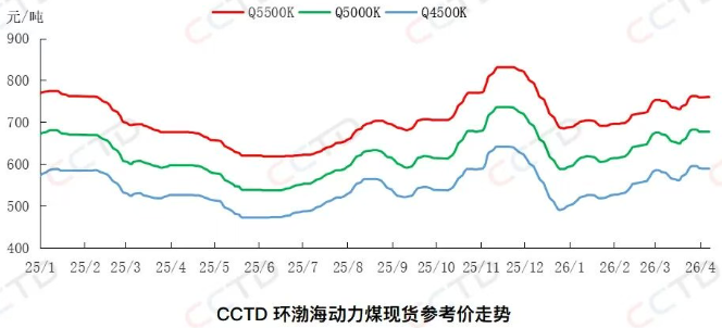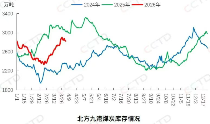 近期,终端需求疲软,仅维持刚需采购,但大秦线检修以来北方港口库存有所去化,导致贸易商挺价心态略有升温,煤价逐步止跌趋稳。截至4月8日,“CCTD环渤海动力煤现货参考价”5500K、5000K、4500K三个规格品价格分别收于760、677、589元/吨,日环比均持平。至此,本轮市场煤价下跌告一段落,上述三个规格品价格分别较前期高点下降2、5、6元/吨。