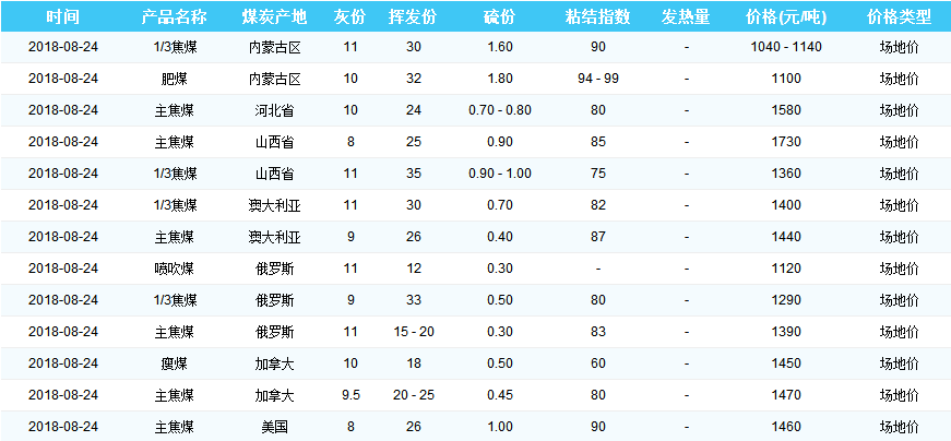 2018年8月24日天津港煤炭价格