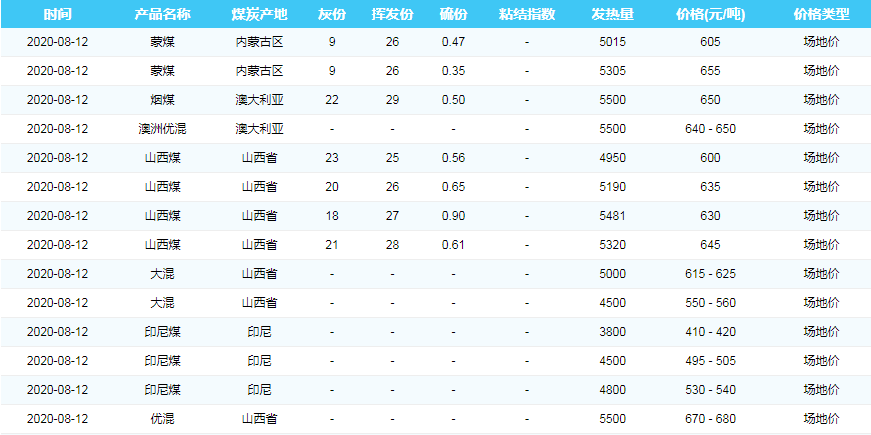 2020年8月12日广州港煤炭价格
