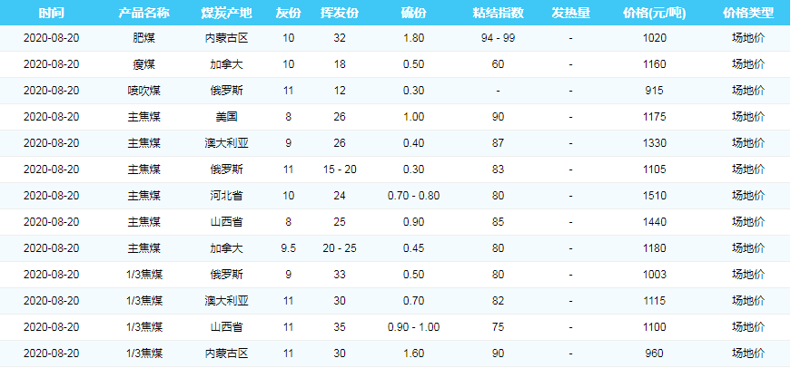 2020年8月20日广州港煤炭价格