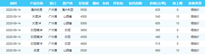 2020年9月14日广州港煤炭价格