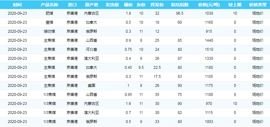 2020年9月23日京唐港煤炭价格