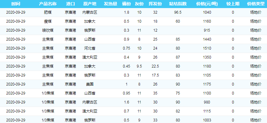 2020年9月29日京唐港煤炭价格