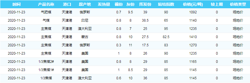 2020年11月23日天津港煤炭价格