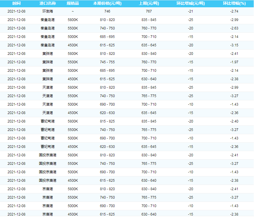2021年11月8日—12月8日中国沿海煤炭运价综合指数