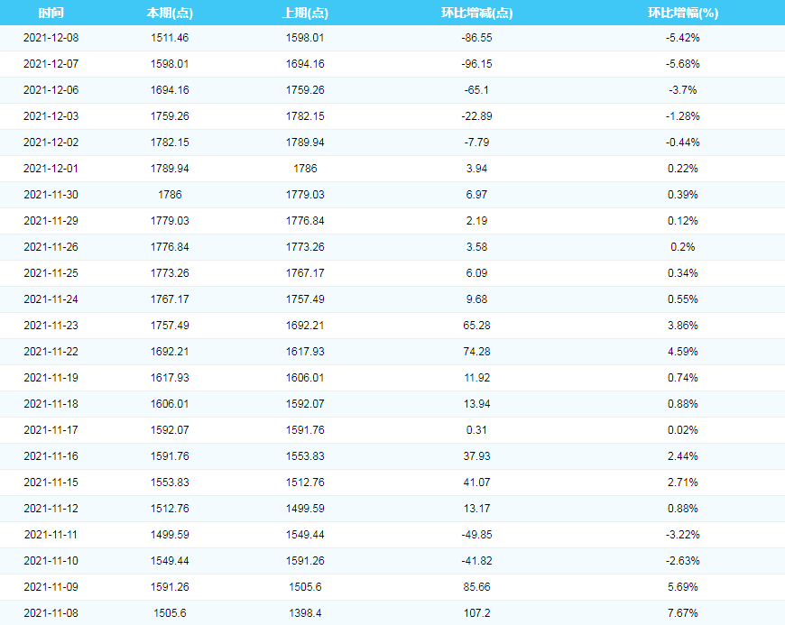 2021年11月8日—12月8日中国沿海煤炭运价综合指数
