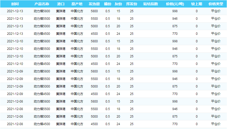 2021年12月8日—12月13日黄骅港煤炭价格
