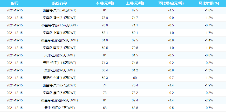 2021年12月15日沿海煤炭运费