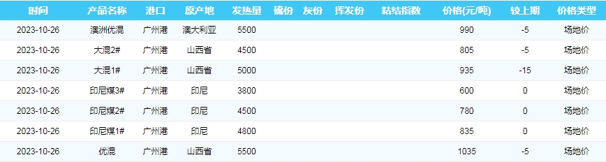 2023年10月26日广州港煤炭价格