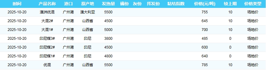 2025年10月20日广州港煤炭价格