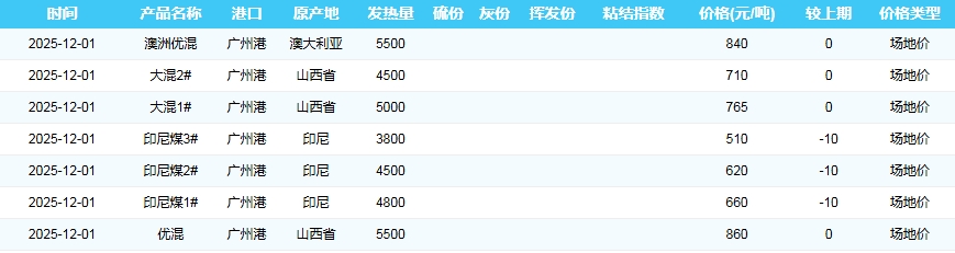 2025年12月1日广州港煤炭价格