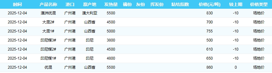 2025年12月4日广州港煤炭价格
