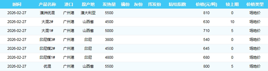 2026年2月27日广州港煤炭价格