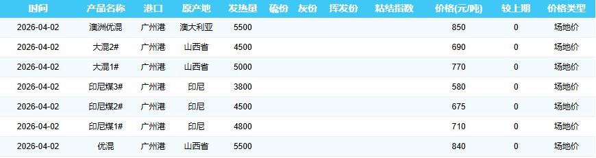 2026年4月2日广州港煤炭价格