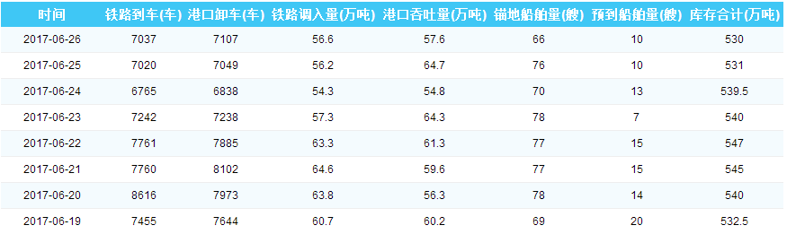 2017年6月26日秦皇岛港港口库存