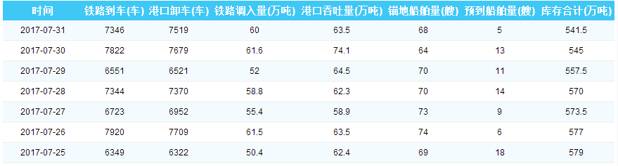 2017年7月31日曹妃甸港港口库存