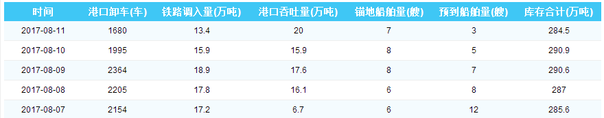 2017年8月11日秦皇岛港港口库存