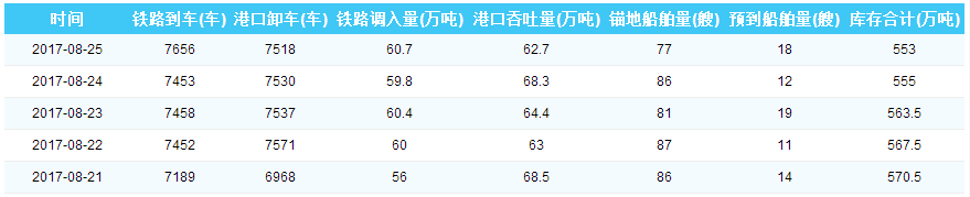 2017年8月25日秦皇岛港港口库存