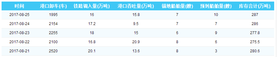 2017年8月25日秦皇岛港港口库存