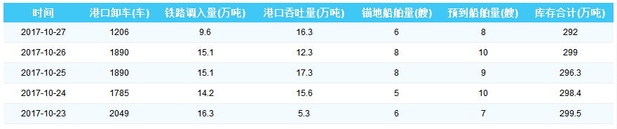 2017年10月27日秦皇岛港港口库存