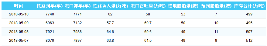 2018年5月10日秦皇岛港港口库存