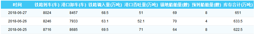 2018年6月27日秦皇岛港港口库存