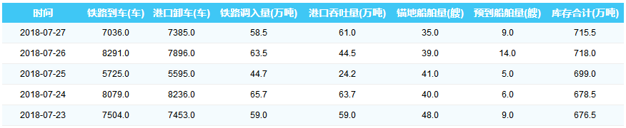 2018年7月27日秦皇岛港港口库存