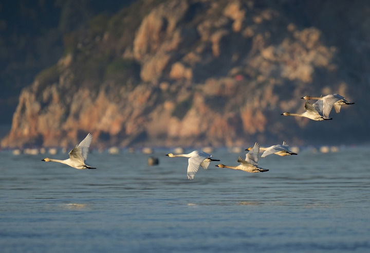 一群天鹅飞过闽江河口湿地上空(2023年1月31日摄)。