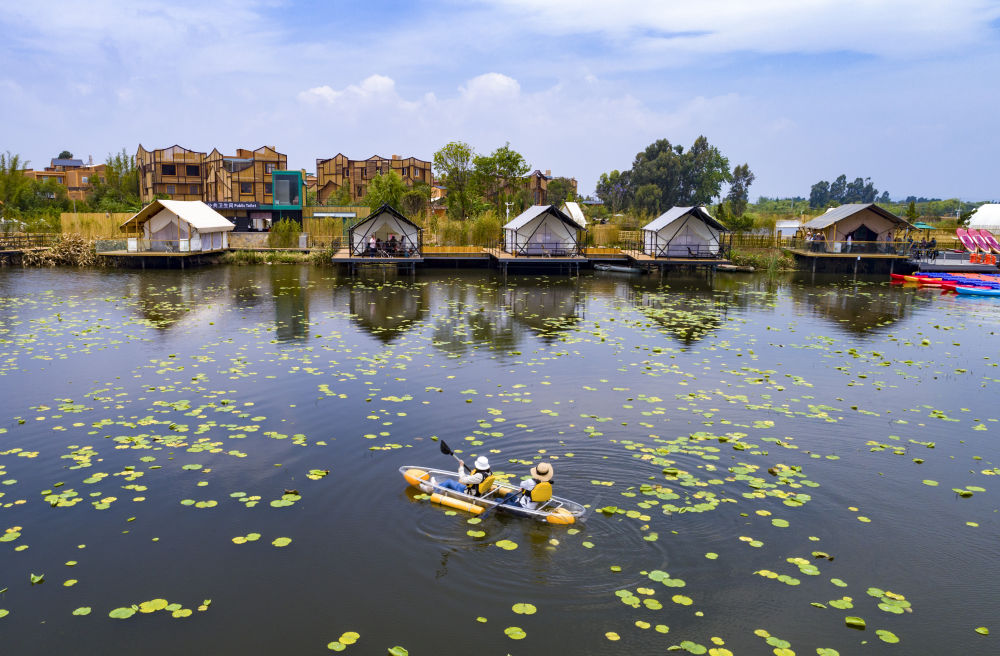游人在滇池南岸晋宁区上蒜镇小渔村划船休闲(2023年4月30日摄,无人机照片)。