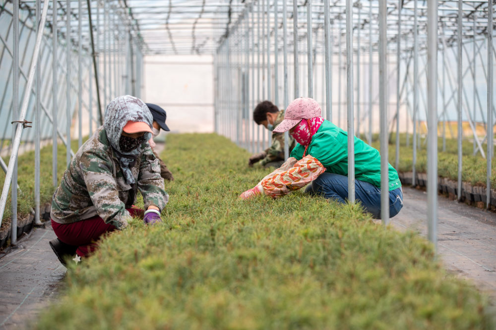 在黑龙江伊春森工集团红松种苗繁育基地,工作人员在养护轻基质红松苗(2023年5月20日摄)。