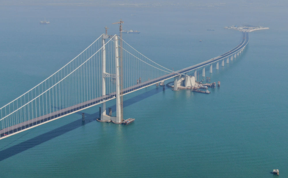 2023年11月28日,粤港澳大湾区超级工程深中通道主线正式贯通,这是深中通道伶仃洋大桥东塔及西人工岛(无人机照片)。