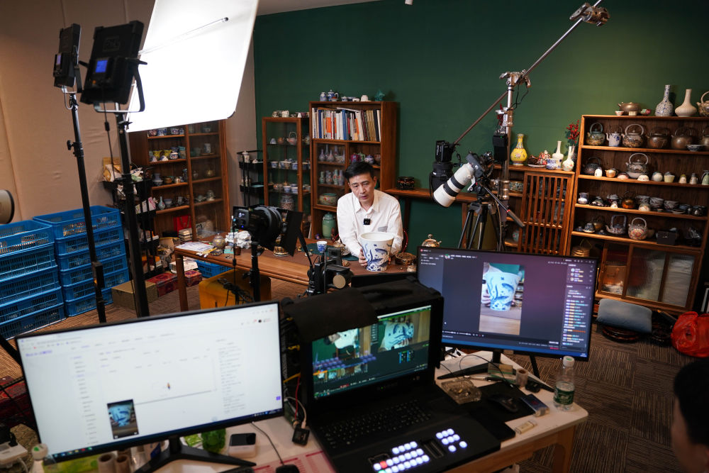 在江西景德镇陶溪川文创街区的直播基地里,工作人员通过网络直播推介陶瓷产品(2023年2月22日摄)。