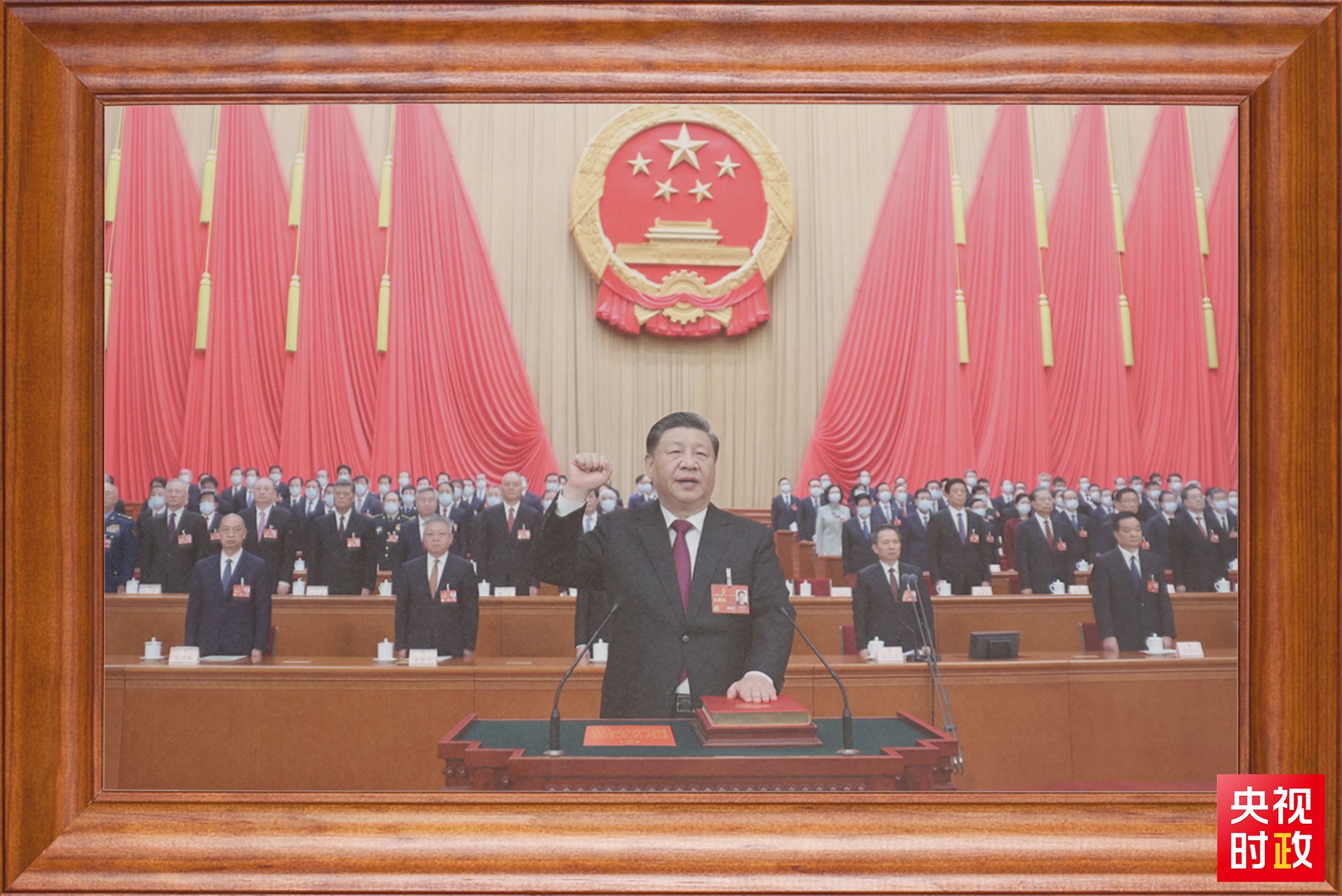 还有一张特别的照片。2023年3月10日,在北京人民大会堂,全票当选国家主席、中央军委主席的习近平,左手抚按《中华人民共和国宪法》,右手举拳,面向近3000名全国人大代表,郑重宣誓。