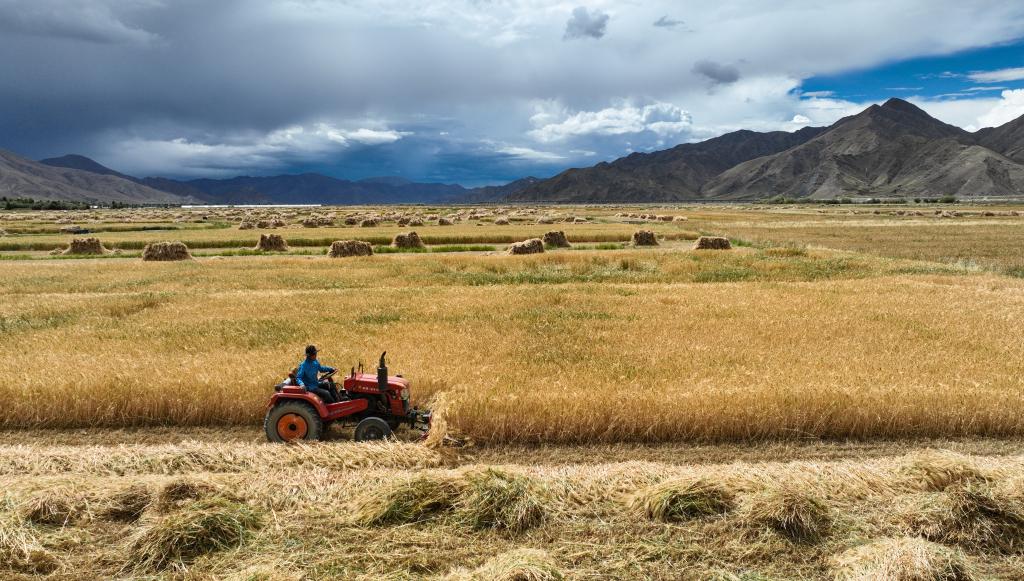 9月10日,在西藏日喀则市白朗县巴扎乡拍摄的秋收场景(无人机照片)。