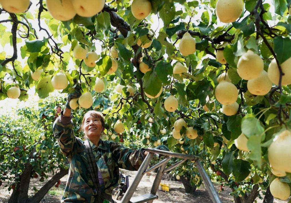 9月13日,河北省晋州市的农民在果园采摘鸭梨。