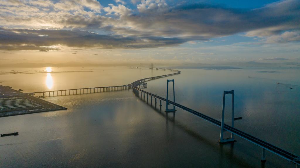6月27日,沐浴在晨曦中的深中通道(无人机照片)。