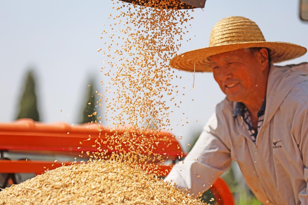 2024年5月25日,山东省临沂市郯城县郯城街道山南头村村民将收获的小麦装车。