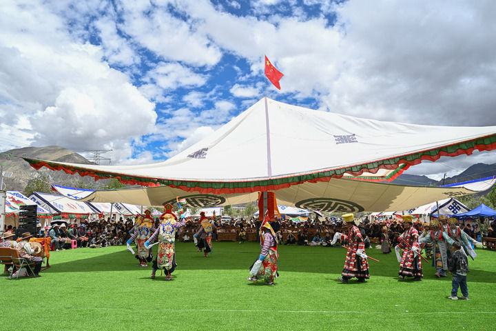 民间藏戏表演队在西藏南木林县非遗公园内表演湘巴藏戏(2025年7月16日摄)。