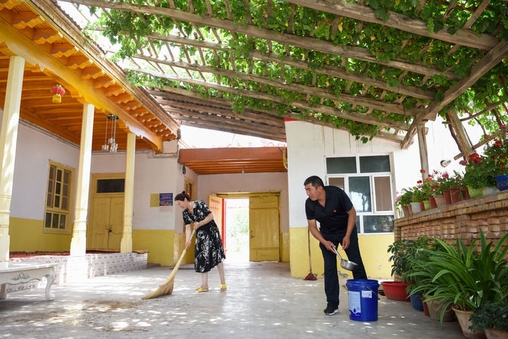在新疆喀什地区疏附县阿亚格曼干村,村民阿卜都克尤木·肉孜(右)和妻子在打扫庭院(2022年6月10日摄)。