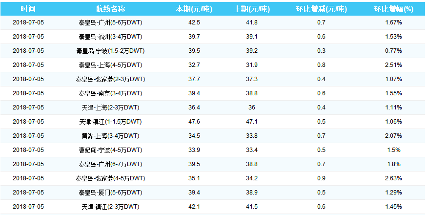2018年7月5日沿海煤炭运费