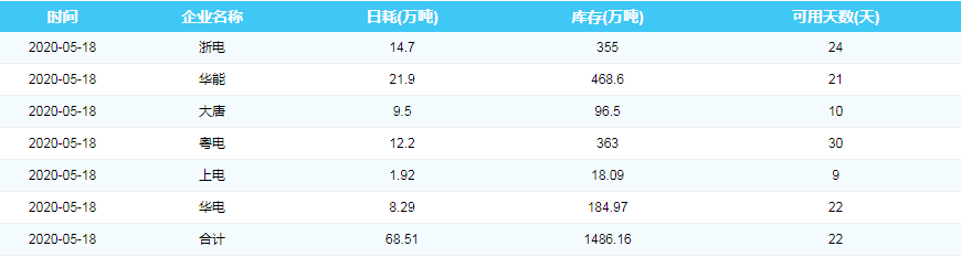 2020年5月18日沿海六大电厂煤炭供耗存指数