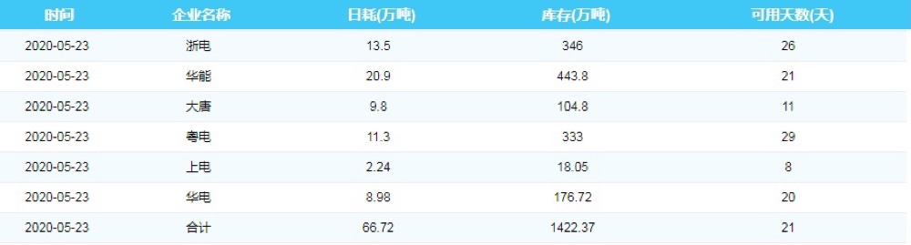 2020年5月23日沿海六大电厂煤炭供耗存指数