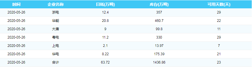 2020年5月26日沿海六大电厂煤炭供耗存指数