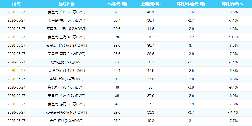 2020年5月27日沿海煤炭运费