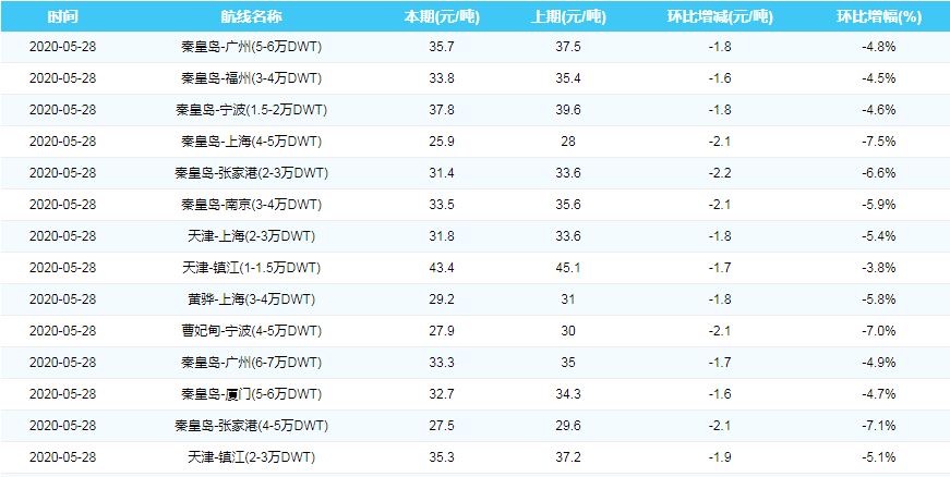 2020年5月28日沿海煤炭运费